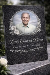 Imagen fotográfica integrada directamente en la lápida con materiales de alta resistencia y protección UV.